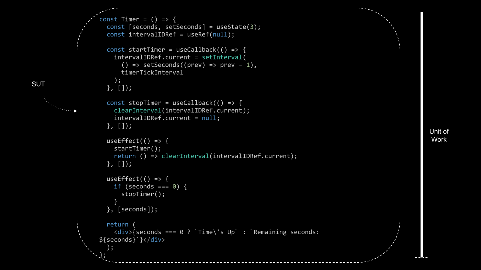 useStatehook 來建立setSeconds以及更新seconds狀態,一般來說,我認為這不是 exit point,因為這只能算是儲存 local variable 的一種方式。但是,這個倒數計時器用到的 timer 是基於使用者的系統時間所設定的,它是由瀏覽器的 JavaScript 引擎實現 timer 的狀態。在這裡不會改變 timer 的狀態而只是做讀取的動作,但 timer 的值的確會不斷自動的改變,進而影響元件的表現,所以這是 exit point。 - 在我寫測試的經驗裡面,測試程式的實作細節或內部狀態是脆弱沒有彈性的,而測試外部的行為和表現會是更穩定的,所以我寫測試時會傾向確保外部行為和表現是正確的,而不是確認內部狀態,所以稍等在測試這一條 exit point 的時候,我會測試的不是